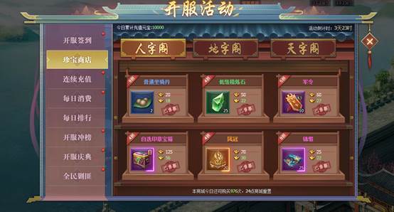 - 地字阁和天字阁需要充值一定额度才能购买里面的道具。