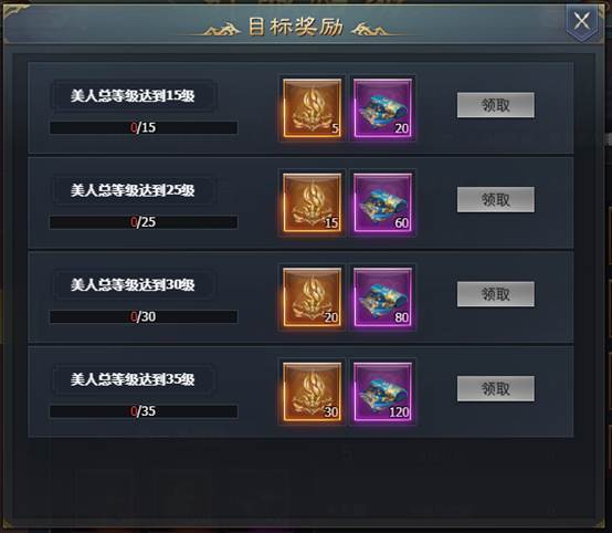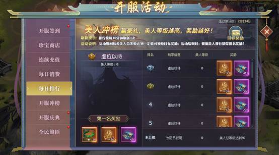 - 第4天【美人排行】:培养美人总等级达到一定值可领取目标奖励,活动结束时,根据美人排行获得排名奖励!