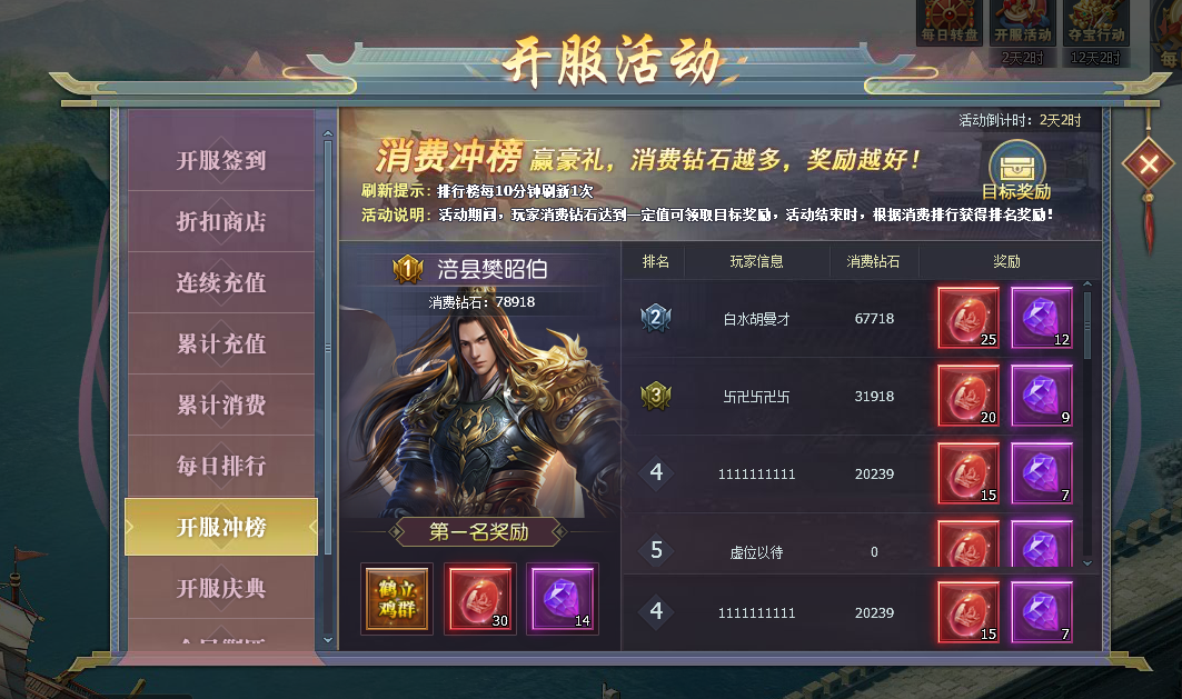 - 消费冲榜:活动期间,玩家消费钻石达到一定值可领取目标奖励,活动结束时,根据消费排行获得排名奖励!